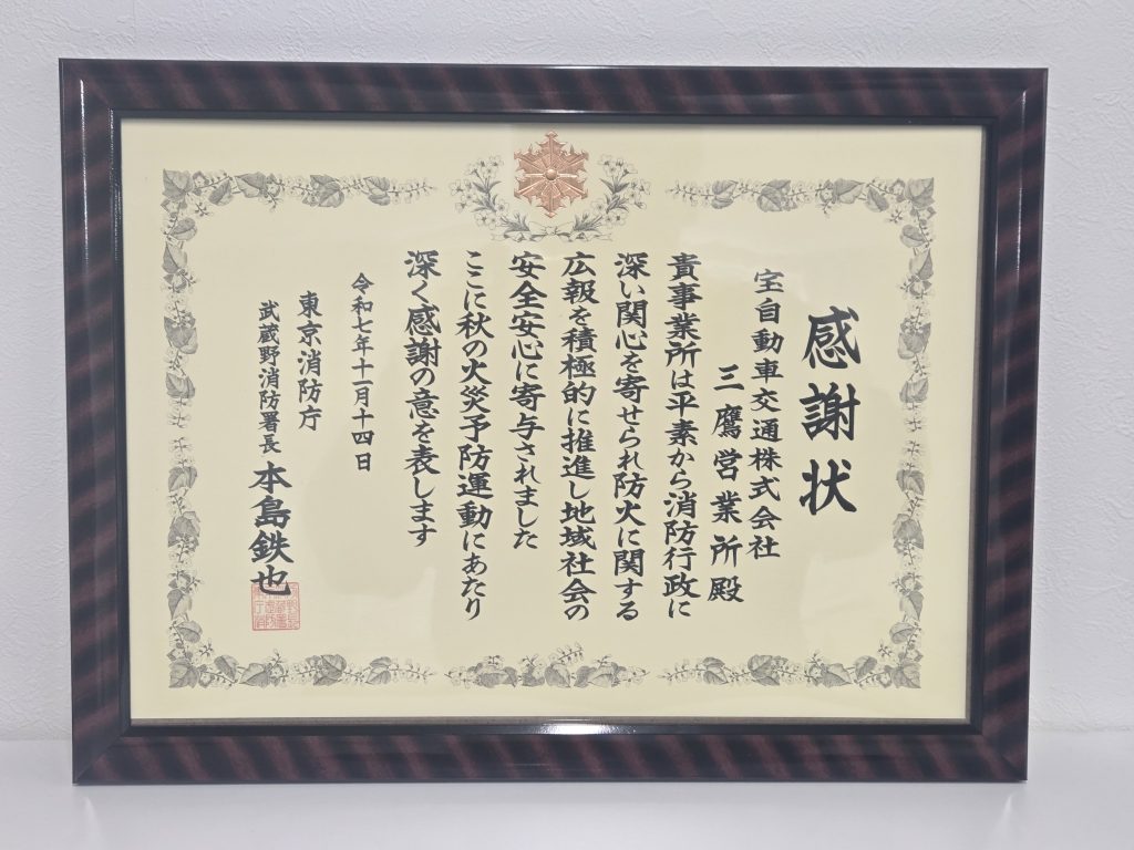 11/14 武蔵野消防署様より防火に関する広報協力により感謝状をいただきました。